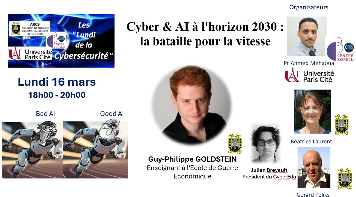 Intervenante et intervenant : Guy-Philippe GOLDSTEIN enseignant à l’Ecole de Guerre Economique. Julien BREYAULT, président de l’association CyberEdu. pour le « quart d’heure des associations ». Demande d’inscription par mail à beatricelaurent.cde@gmail.com Participation gratuite, Pour plus de renseignements sur cet évènement : |